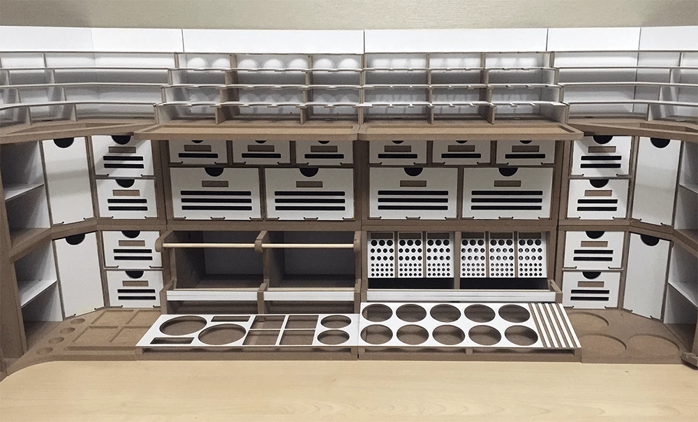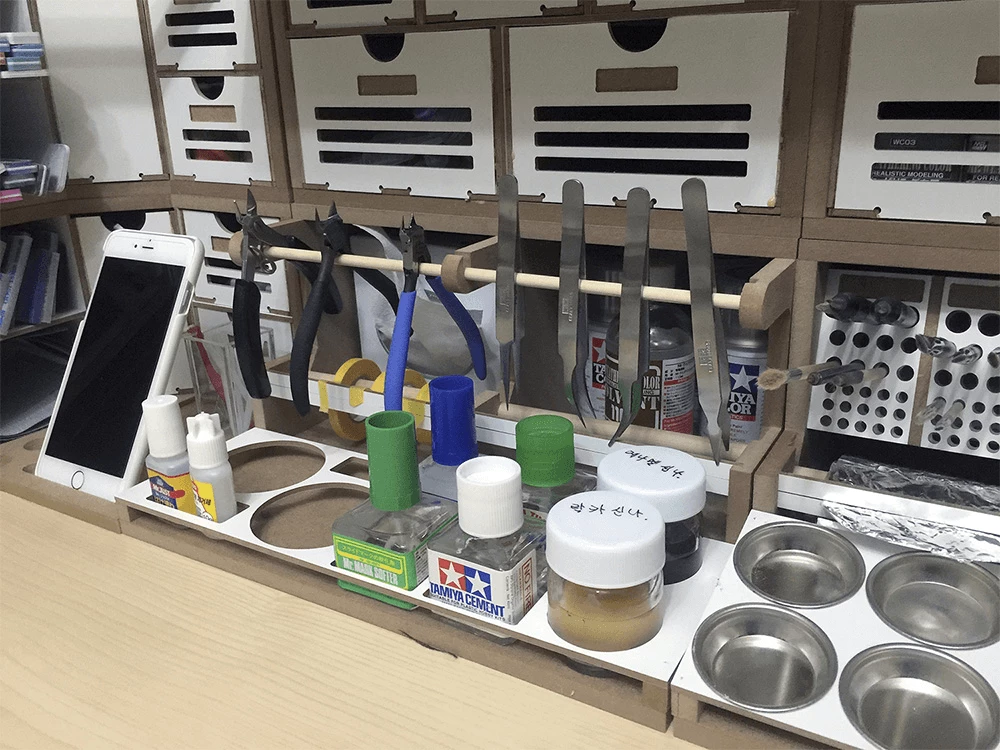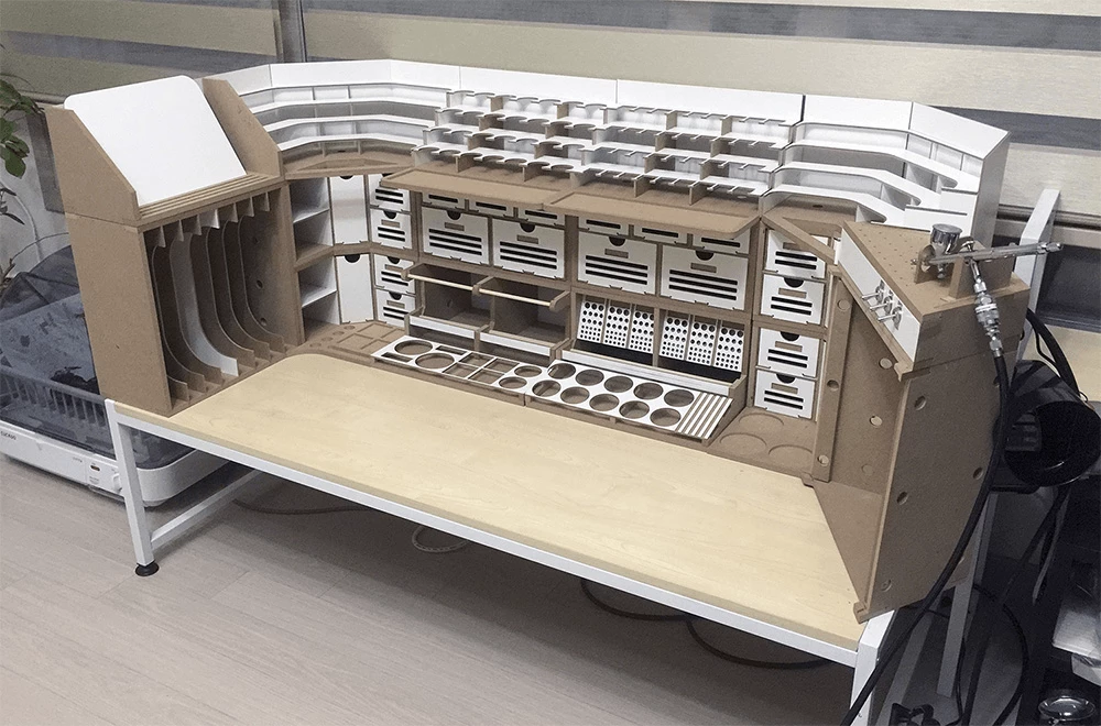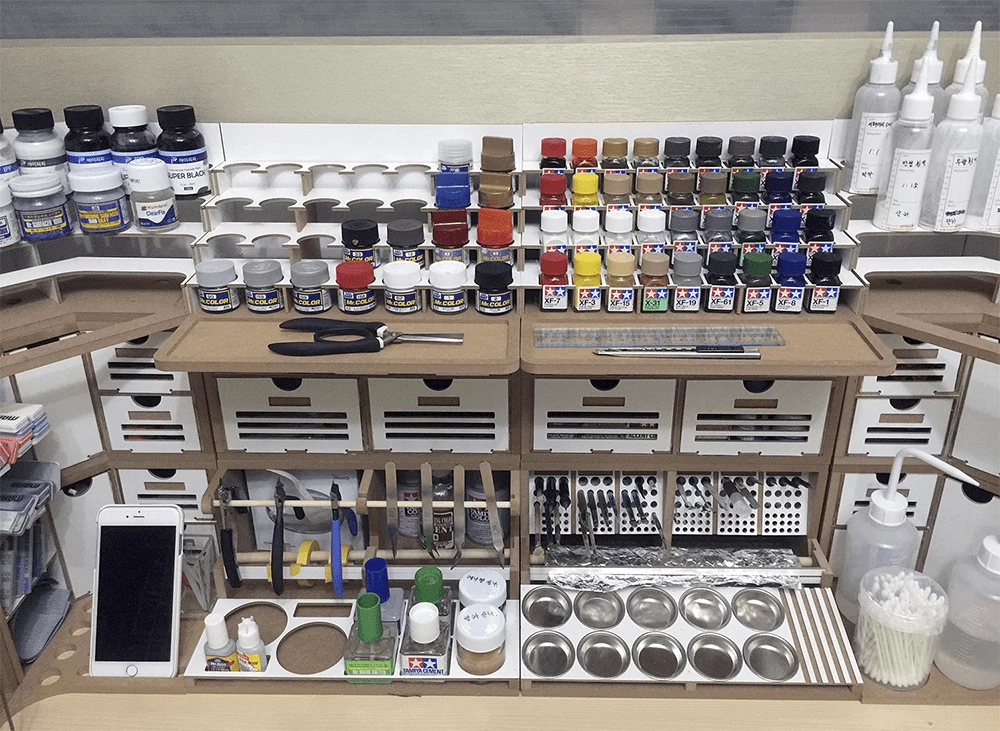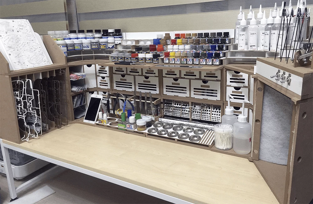 This product is a large workbench/workstation used to manufacture Hobby-Model-Kit and Gundam-Kit. Includes a spray booth and can storage very large amounts of paints . and contains all necessary functions for the hobby modelling, such as Nipper/Tweezer Holder, Brush/Tool Holder, manuals stand, Runner stands, and various sizes of drawers.