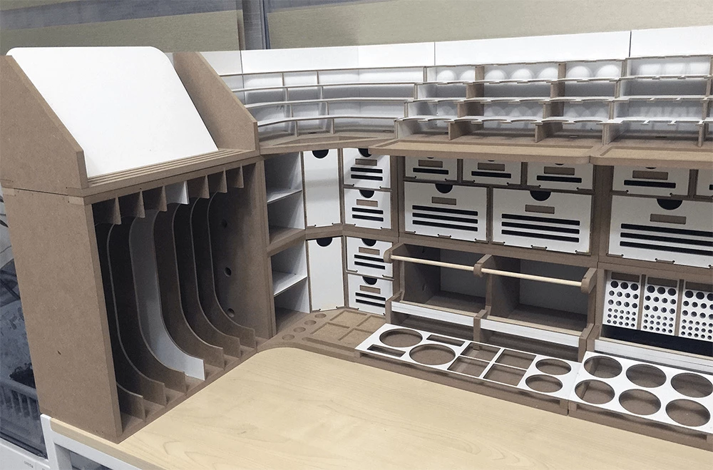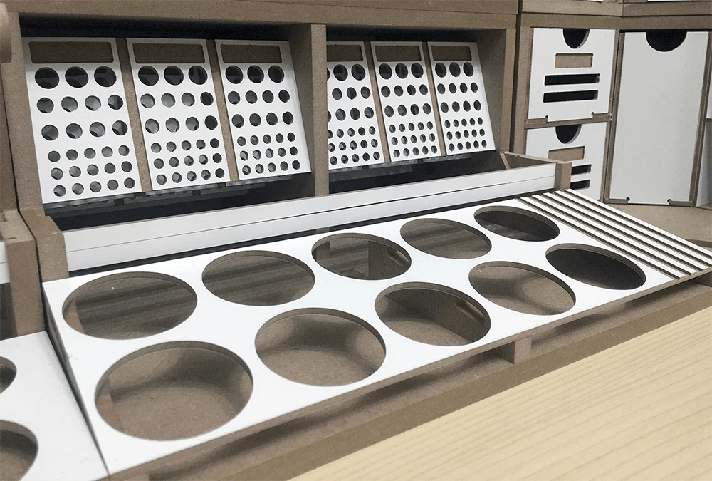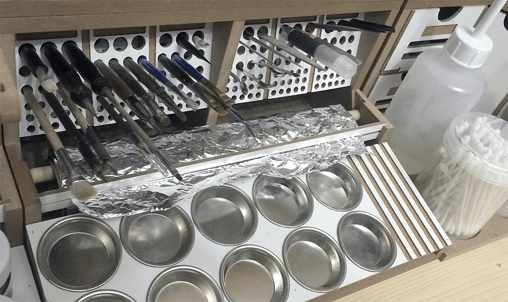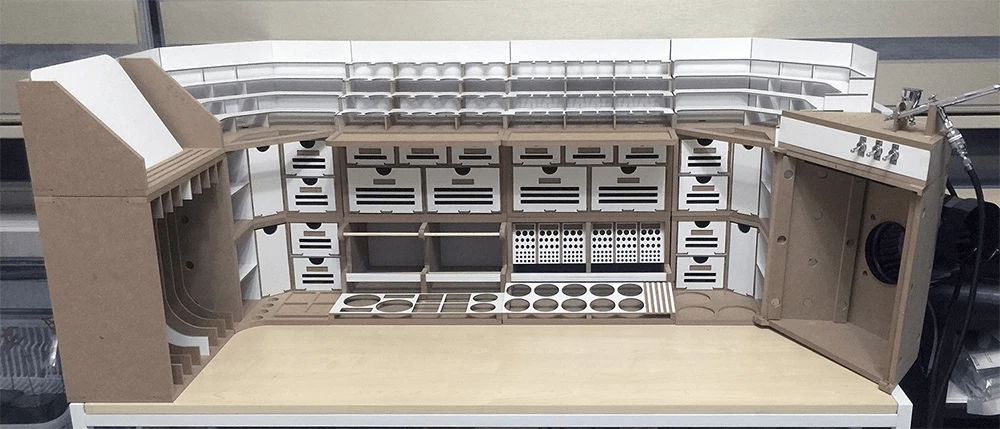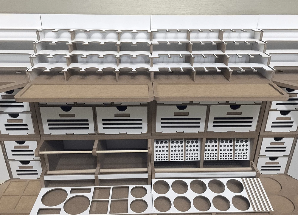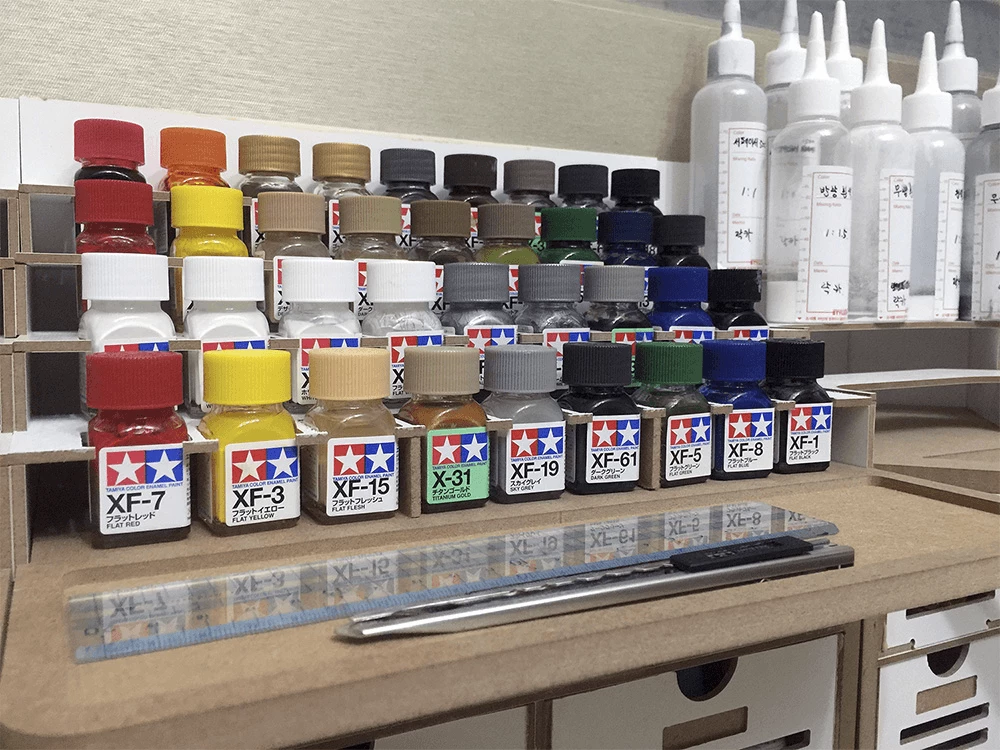 This product is a large workbench/workstation used to manufacture Hobby-Model-Kit and Gundam-Kit. Includes a spray booth and can storage very large amounts of paints . and contains all necessary functions for the hobby modelling, such as Nipper/Tweezer Holder, Brush/Tool Holder, manuals stand, Runner stands, and various sizes of drawers.