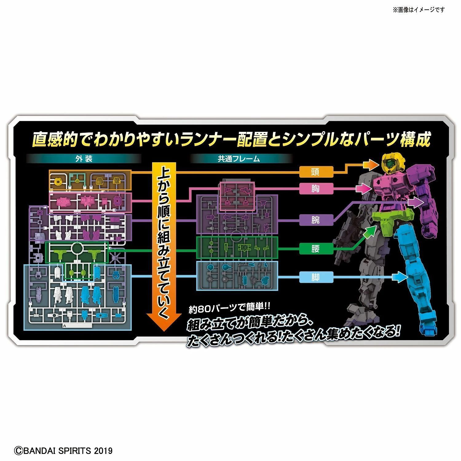 Bandai brings us a new lineup of endlessly customizable, easy-to-build mecha model kits with 30 Minutes Missions (30MM)! Representing mass-produced robots, these kits are perfect for army-building and feature a common joint system so parts can easily be switched between the different types of units. Each kit builds into a highly posable figure with armor; in addition, the armor parts are equipped with hard points to attach weapons.