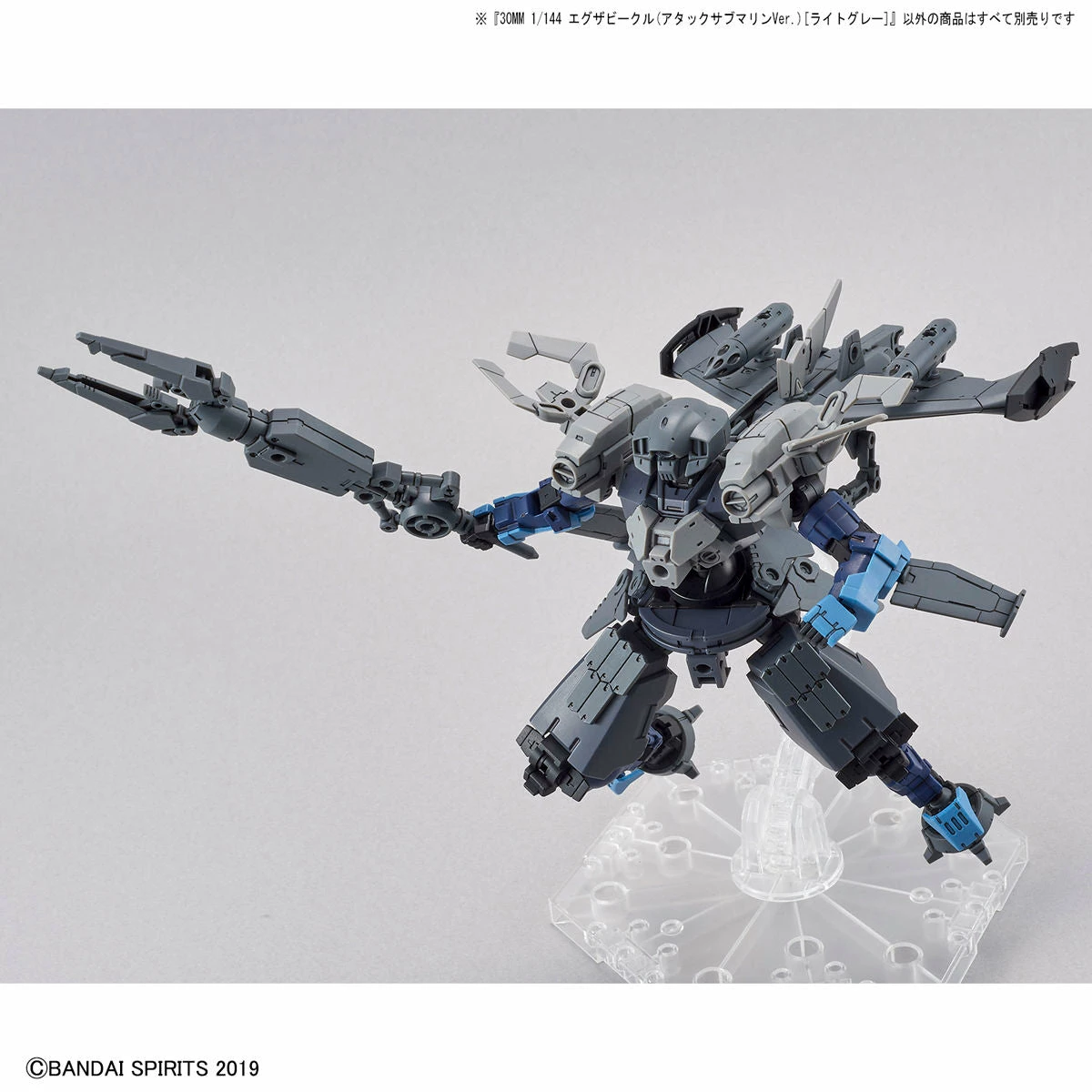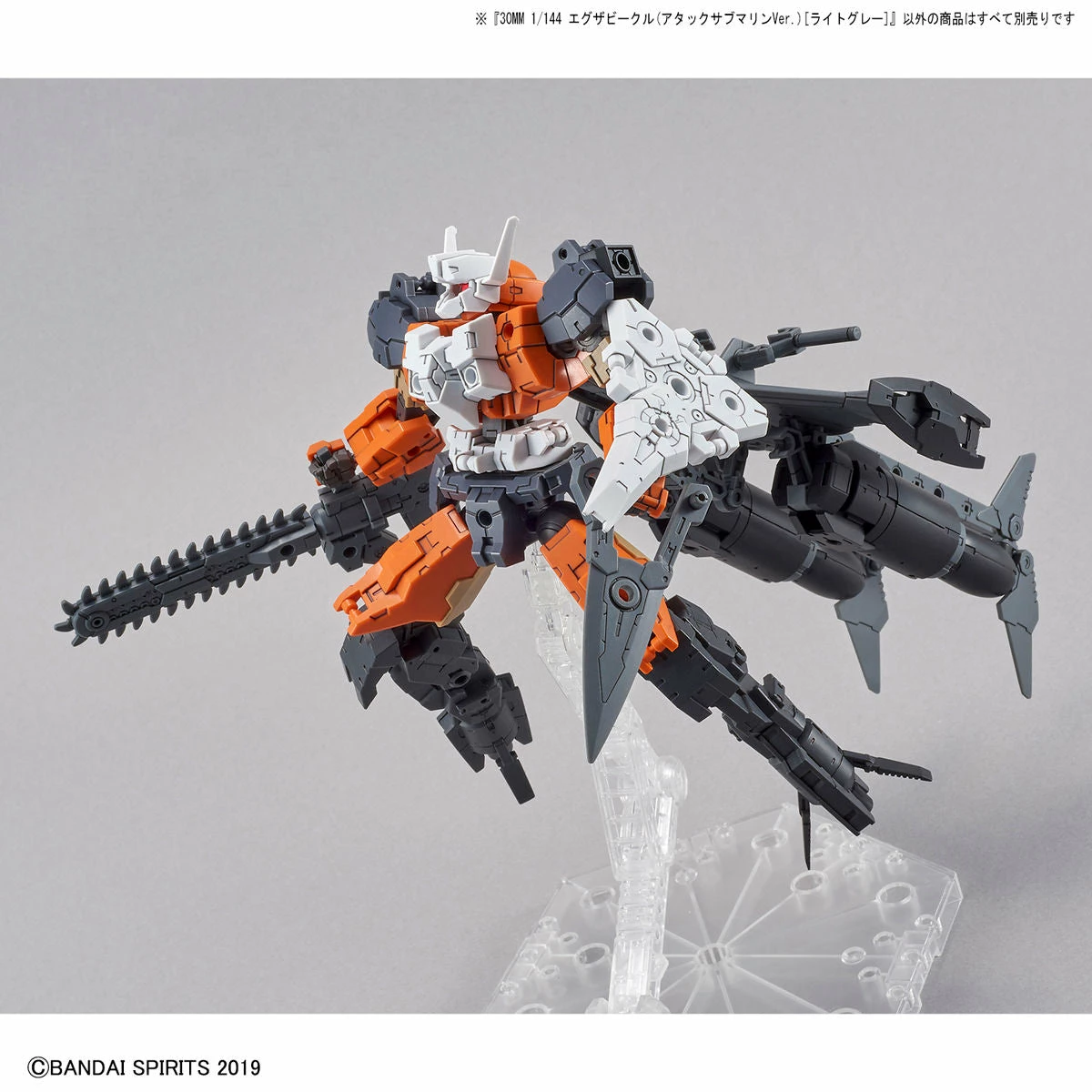 The 30 Minutes Missions EXA, or Extended Armament, continues with the Attack Submarine. By changing the parts, it can be transformed into 3 types: ray type, saw shark type, and hammerhead shark type. It can also be used as a backpack for 30MM mecha or other similar sized model kits.