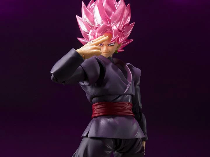 Goku Black in Super Saiyan Rose form returns to the S.H.Figuarts line in a special colorway, featuring a shiny pink metallic finish on his hair.