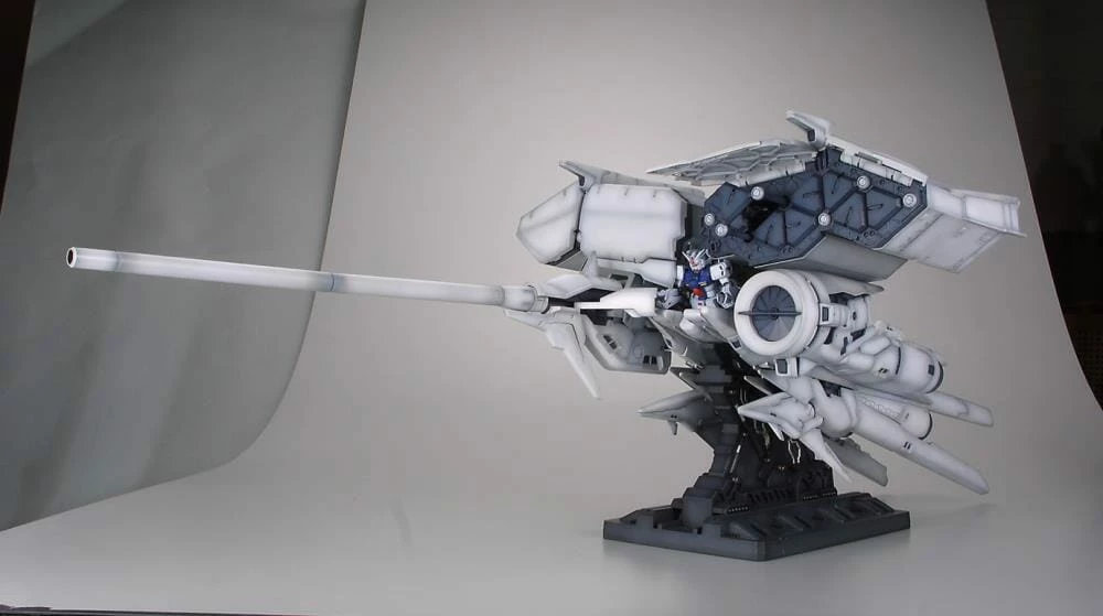 The massive weapons platform featured in Gundam 0083 Stardust Memory has been faithfully reproduced as a 1/144 scale model kit. With a length of 3 Feet and width of almost 2 feet, this monstrous model features unrivaled detail and mechanisms comparable to the highly regarded Perfect Grade series, and is even larger. A small amount of die-cast is integrated in the construction of the fuselage to provide the model kit stability, while screws hold various sections together.