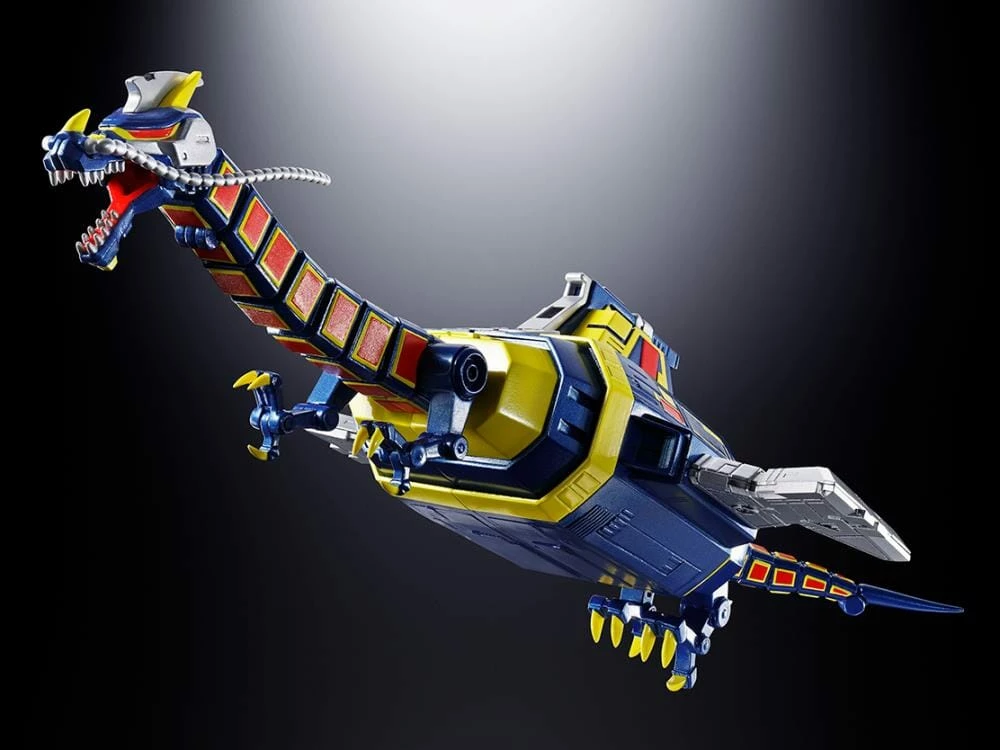 From SPACE SHERIFF GAVAN comes the mighty Denshi Seijyu Dol, who joins Soul of Chogokin as a fully transforming toy! The set also includes the Guillan Enban that serves as Gavan’s mobile base of operations. The pair can be docked together to replicate dramatic launch scenes from the series including playback of the theme song from an embedded chip! Three enemy saucers are included as accessories