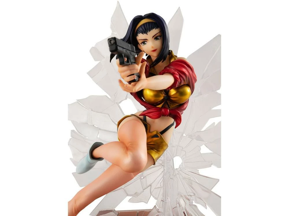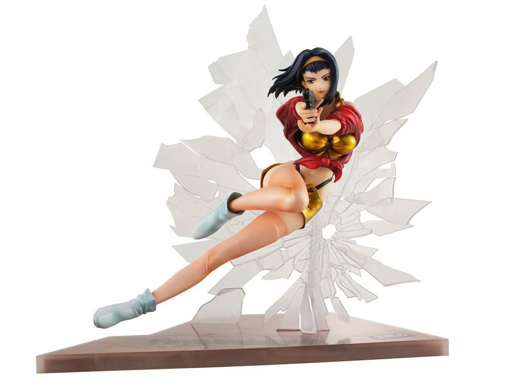 Faye comes crashing in for some action as a 1/8 scale 1st Gig figure from MegaHouse! She includes a broken glass background and a base with her name on it. Collect the separately-sold Spike Spiegel to complete the display.