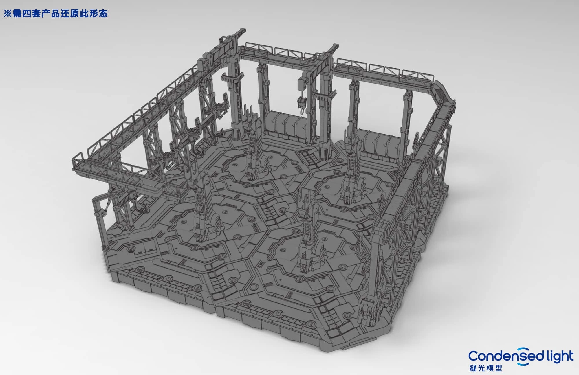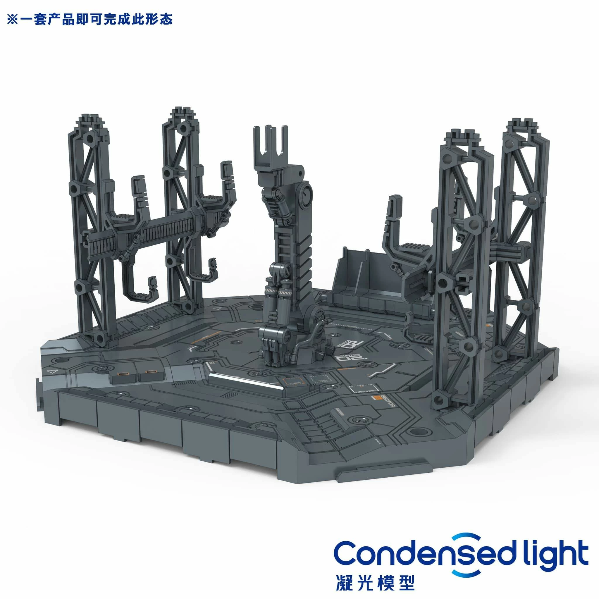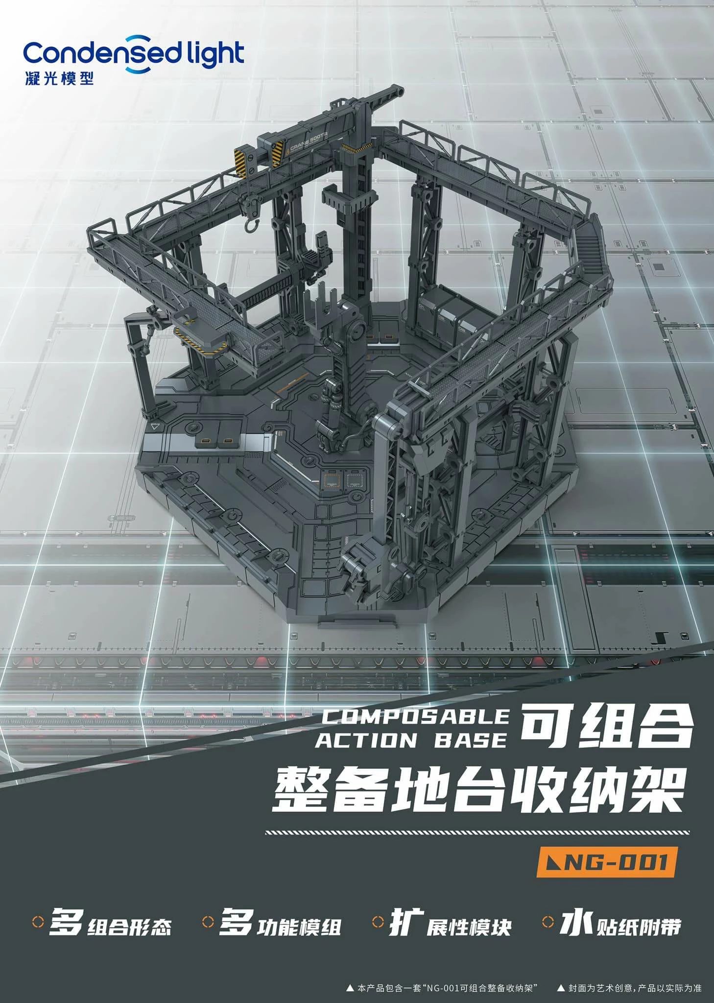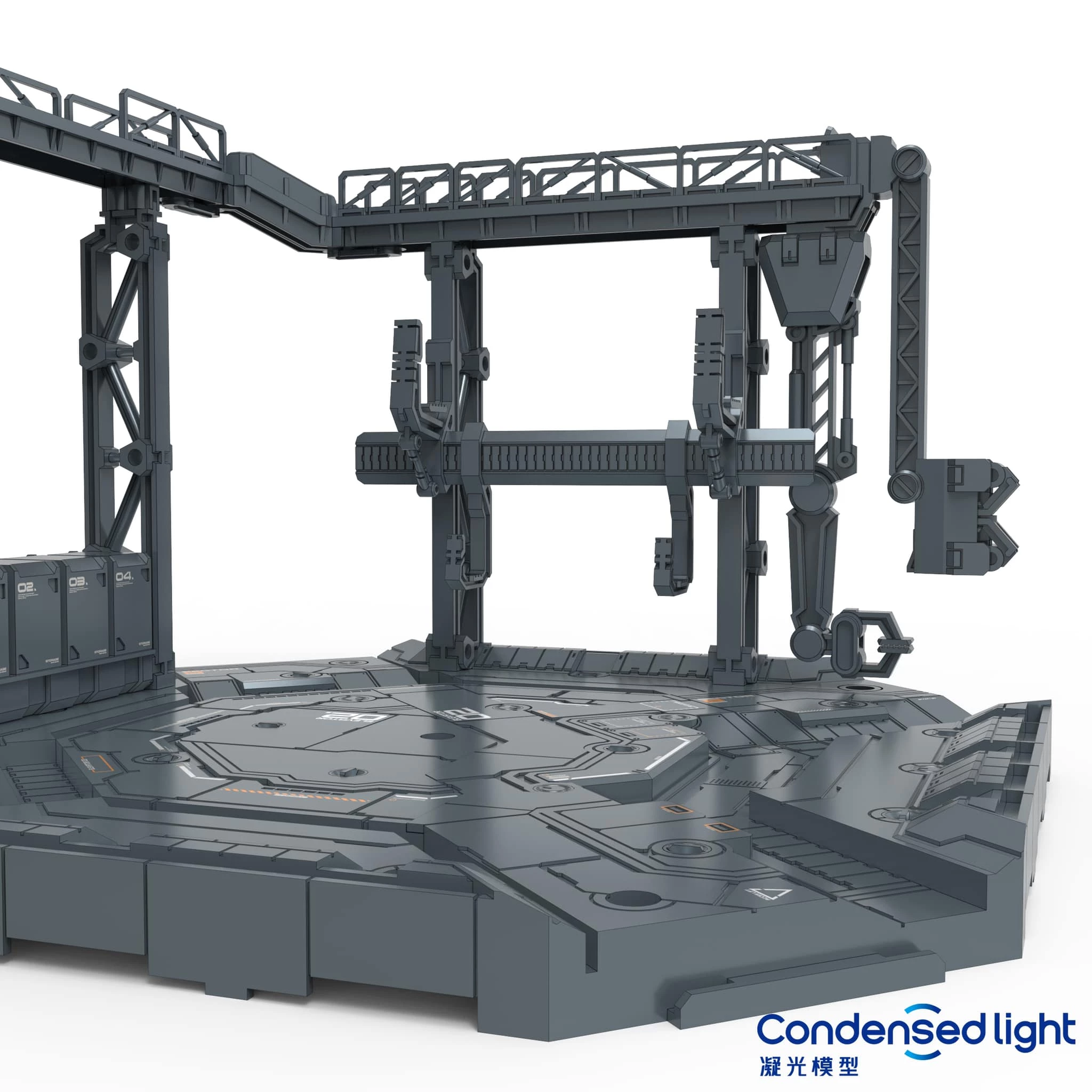 Easily customized to fit with both 1/100 and 1/144 scale kits! Set includes one section with walkways and cranes, weapon hooks, as well as two arm grips. This set also includes one set of waterslide decals for added details and customization.