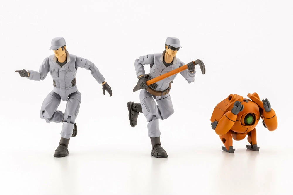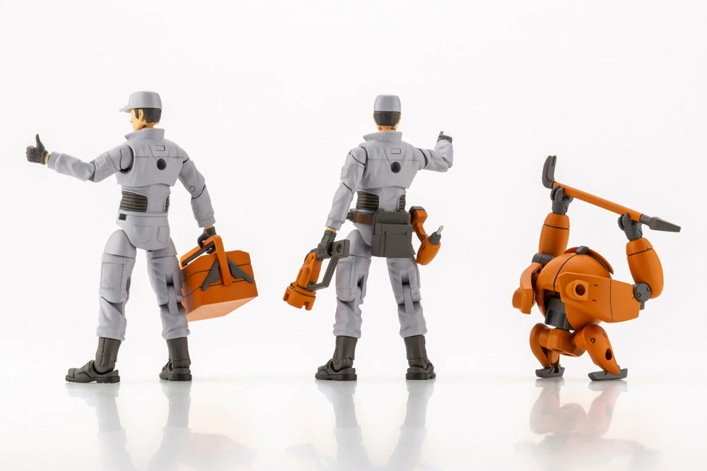 The long-awaited model kit of combat service support units has been released from the Governor series! The concept is a set of 1/24 scale mechanics with detailed articulation. The design is based on the idea of support mechanics assembling HEXA GEAR machines. The modelscan be displayed with the various tools included in the kit to create realistic building scenes. The 1/24 scale is widely used in plastic car models, so the model can beenjoyed in a variety of ways. The engineers come in a set of two with different heads. There are two types: bare face and with goggles. Eye decals are included so there is no need to paint miniature eyes on the face. The engineer’s waist bag is removable.The droid has articulated joints to create scenes with it supporting the engineers, and can also be combined with other HEXA GEAR models.Two types of tool boxes are included, one for carrying and one open.