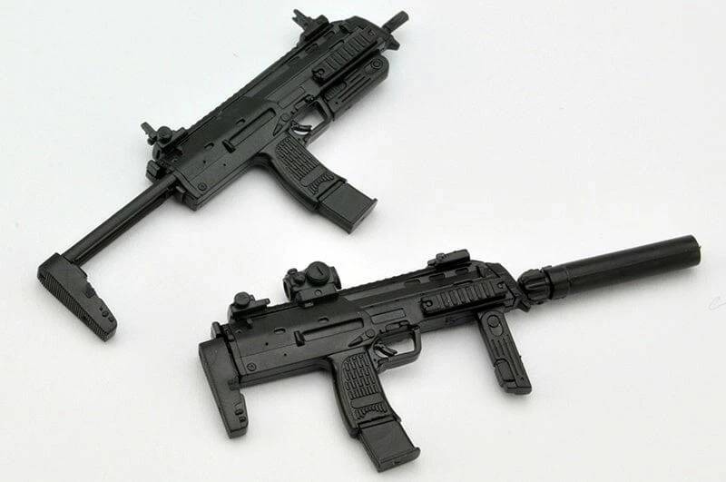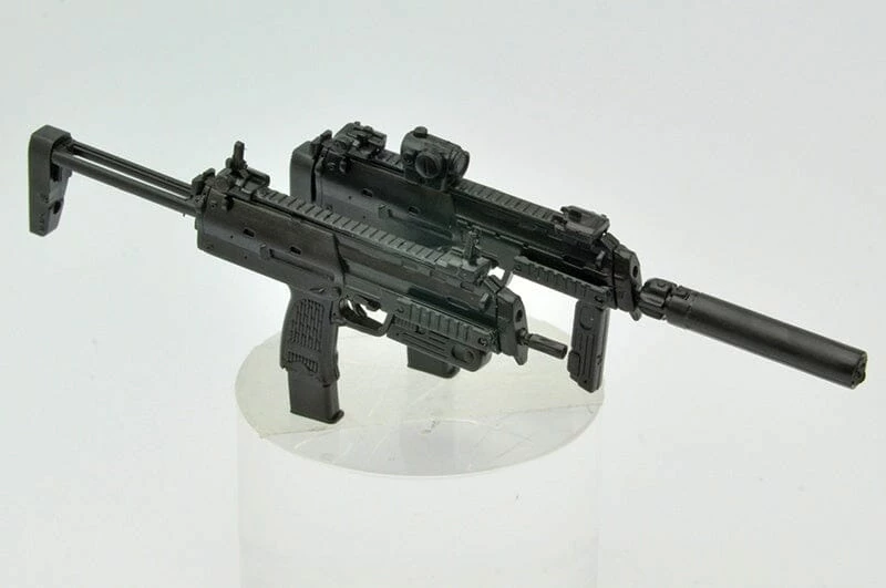 This model kit features new parts for the low-profile mount T1 dot sight and 30 magazines. A special sound suppressor that was attached to the conventional MP7 type, a high-mount T1 dog sight, and a laser aiming module are included as bonus parts. Two gun bodies are included: one with a collapsed stock and one with an expanded stock. The two-stage trigger with a safety device and the non-slip pattern on the grip are carefully reproduced, and a postcard-sized illustration card is also included.