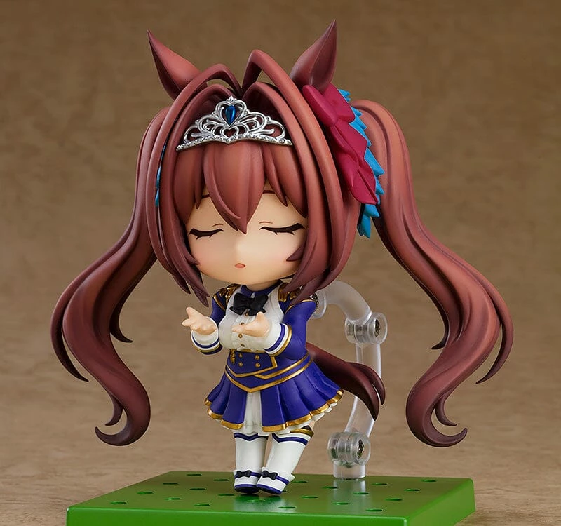 From the game “Umamusume: Pretty Derby” comes a Nendoroid of Daiwa Scarlet, the Umamusume who always strives for first place! She comes with three face plates including an energetic smiling face, a determined face often seen by her rivals, and a kissing face from her performance of one of the game’s popular songs! Optional parts include a large Nendoroid base made to look like racetrack turf along with a racetrack fence. Enjoy creating racing poses in Nendoroid form! Be sure to add Daiwa Scarlet, the Umamusume who will take on any challenge to be the best, to your collection!